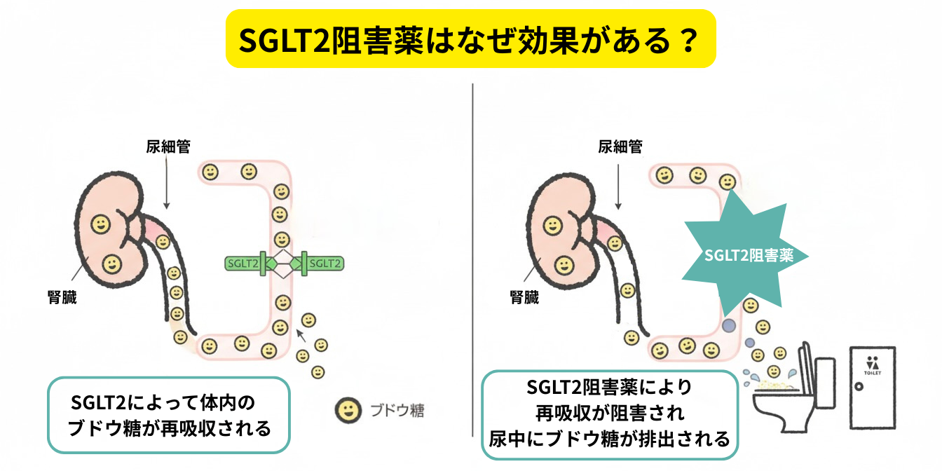 SGLT2阻害薬は、腎臓の働きを利用して余分な糖を尿と一緒に体外へ排出する薬です。