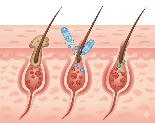 アダパレンは毛穴の角化を正常に整えて毛穴詰まりを改善し、新しいニキビの発生を防ぐ働きがあります。