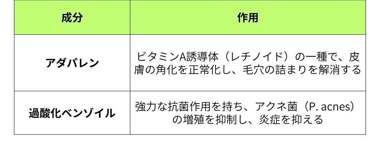 アダパレンと過酸化ベンゾイルの2つの有効成分が相互に作用し、毛穴詰まりの改善と抗菌効果を同時に発揮する点が特徴です。
