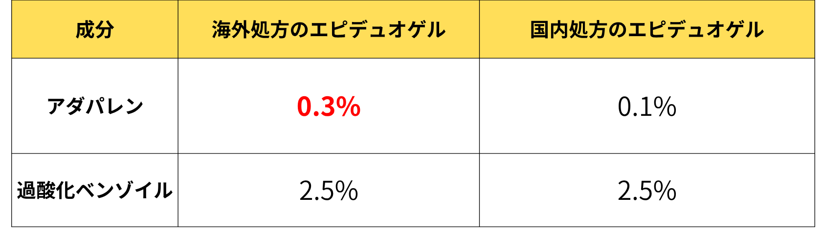 エピデュオゲルはアダパレン0.1%と過酸化ベンゾイル2.5%の配合ですが、エピデュオフォルテはアダパレンを0.3%含有し、過酸化ベンゾイルは同じく2.5%の組成です。