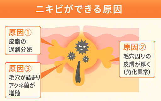 ニキビは毛穴に皮脂が詰まってアクネ菌が増殖し、炎症を起こした状態を指します。