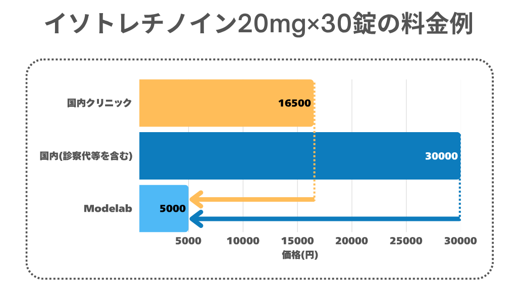 Modelabではイソトレチノイン20mg×30錠が5,000円程度で購入でき、価格面での負担が軽くなります。