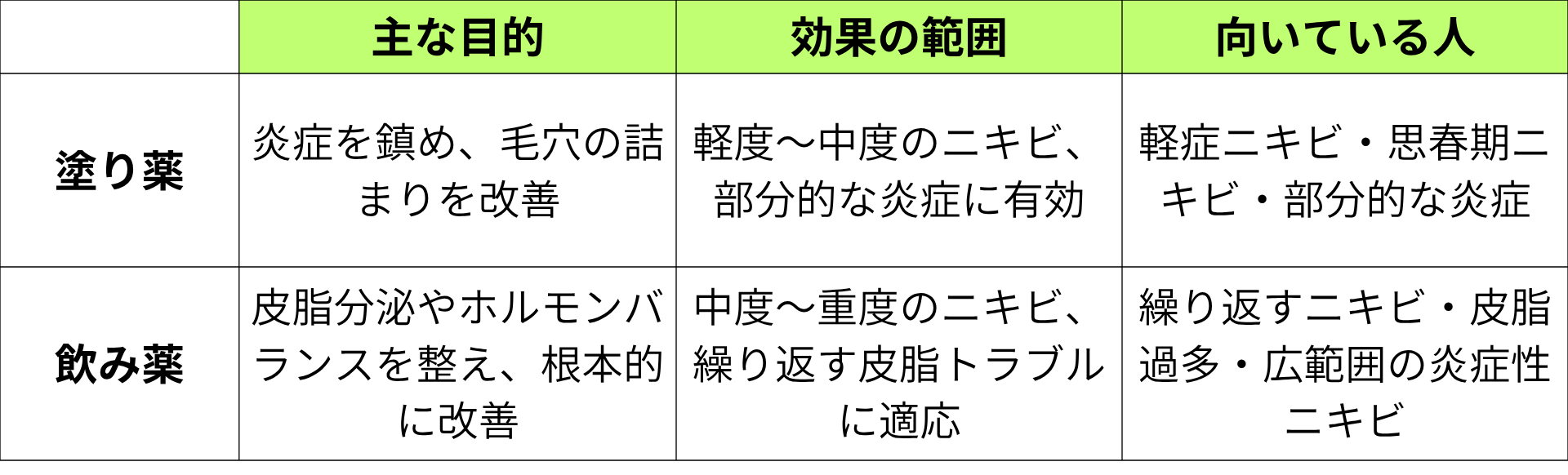 ニキビ治療では、症状の重さや肌の状態に応じて塗り薬と飲み薬を使い分けます。