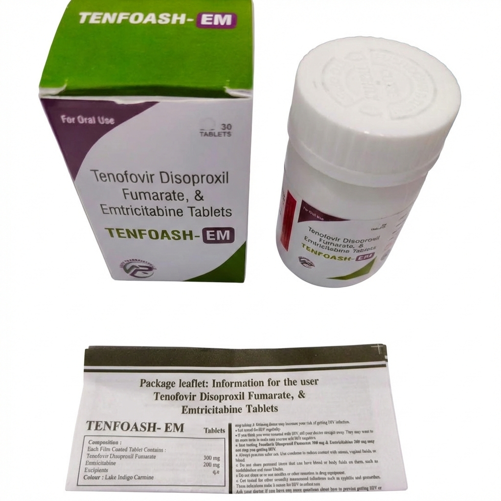 TENFOASH(テンフォアッシュ)は、エムトリシタビン(Emtricitabine)200mgとテノホビル ジソプロキシルフマル酸塩(Tenofovir Disoproxil Fumarate)300mgを配合したHIV治療・PrEP(暴露前予防投与)に使用される抗HIV薬の後発品(ジェネリック)です。先発品であるツルバダ(ギリアド・サイエンシズ社)と同一の有効成分・用量を持ち、WHO必須医薬品リストにも掲載されている信頼性の高い薬剤です。